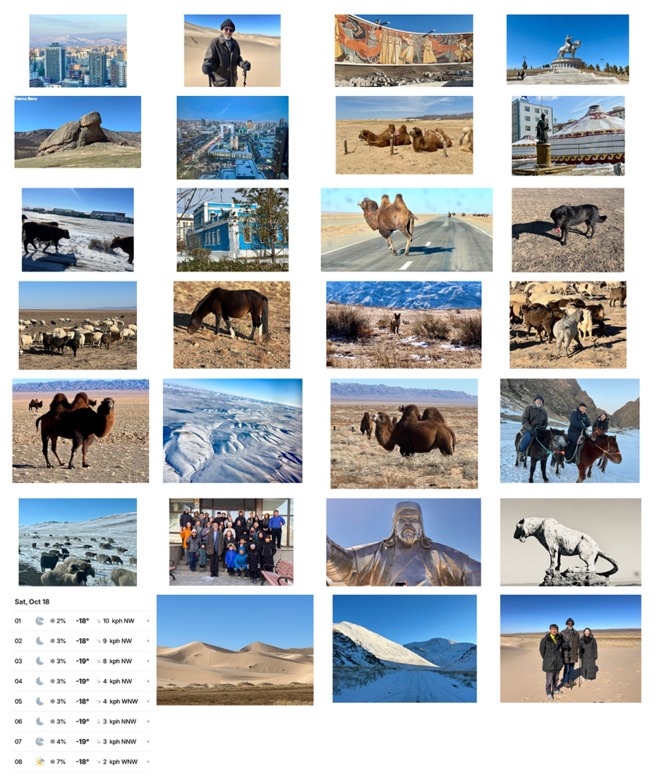 Row 6: Wildlife abounds in Outer Mongolia. (Inner Mongolia is part of China) / Impromptu fellowship shot / Chinggis Khaan has 16 million living descendants / Mongolian Snow Leopard, a rare and endangered species
